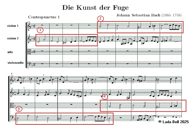Dans l’illustration 1, vous pouvez voir quatre apparitions du thème au début du Contrepoint I de L’Art de la fugue de Bach.