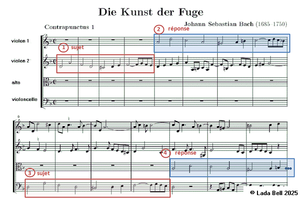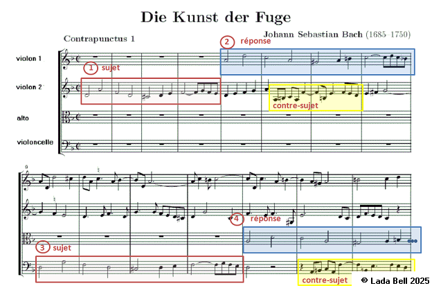 Cette illustration nous présente une autre règle de la fugue : elle commence toujours par l’exposition du thème dans chacune des voix.